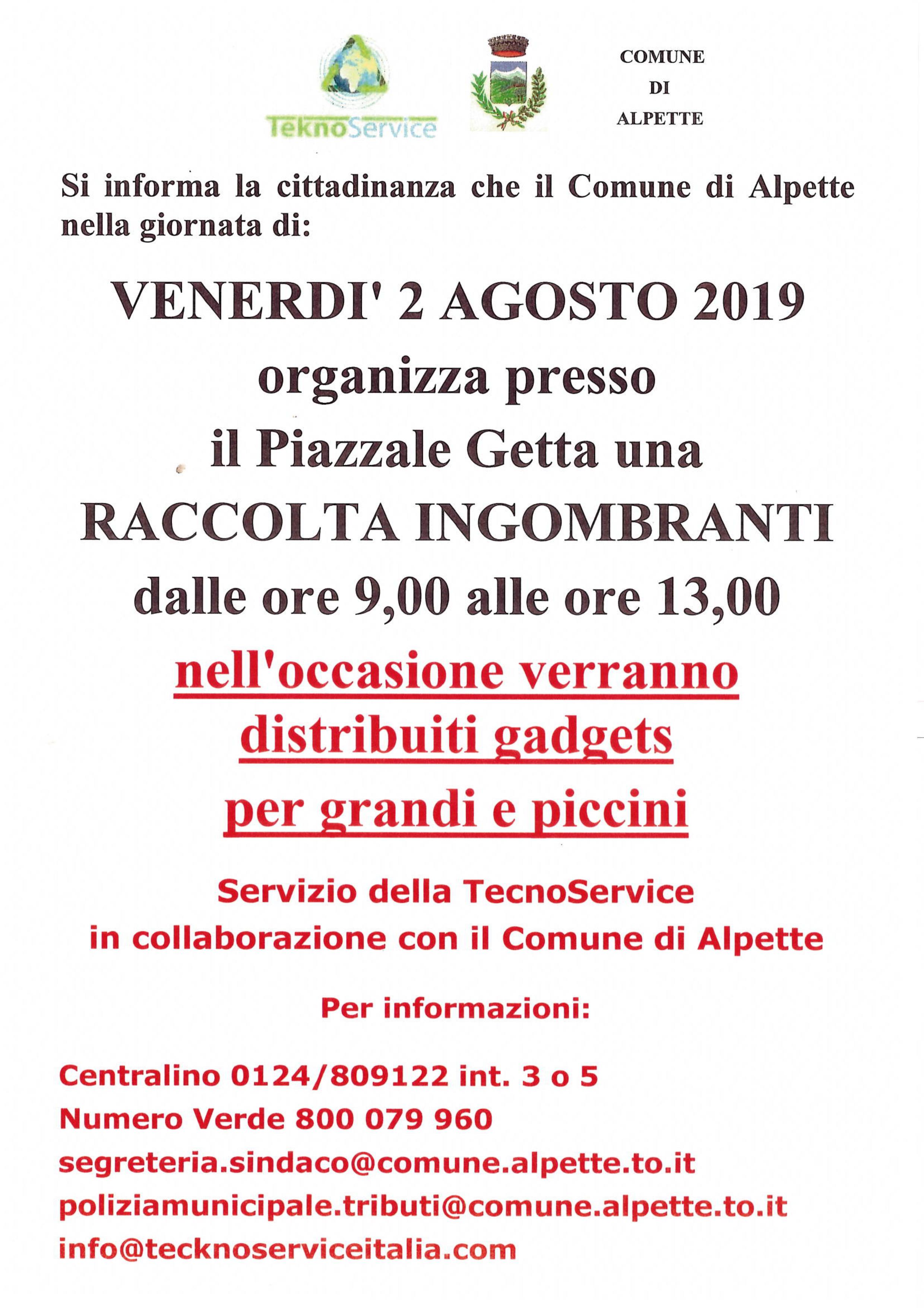 Ultima giornata ecologica "PULIAMO ALPETTE" iniziativa fortemente voluta dell'Amministrazione Comunale e sostenuta fattivamente dalla Società Tecknoservice. Trattasi di eventi con animazione e gadget per i bambini per far capire al Cittadino e al Villeggianti, che d'estate popolano il ridente paesino di montagna nell'area del Gran Paradiso, ad avere un approccio più corretto con il trattamento del rifiuto e dell'ingombrante. Venerdì 2 agosto presso piazzale Getta a partire dalle ore 10 incontro con la Cittadinanza con i Relatori: Dott.ssa Crespan di Tekniservice, Vice Sindaco Goglio Graziano, il Consigliere Comunale Dino Reginato, il Sindaco di Cuorgnè Beppe Pezzetto, il Consigliere Regionale Mauro Fava. Deve essere un momento di riflessione per il rispetto del territorio montano che trascurato e maltrattato porta serie conseguenze e rischio di pericolosi incendi, inquinamento delle falde acquifere, disincenticazione all'industria del Turismo. Non capire l'importanza di questo vuol dire non comprendere il delicato equilibrio ecosostenibile delle terre alte. Alpette e questa Amministrazione non è la prima volta che tratta che tratta questi argomenti, lo fece nella passata legislatura in un paio di occasioni con la presentazione del libro "meno 100 kg" di Roberto Cavallo e sempre con Lui e la giornalista Gullotta su Rai 1 per il "Keep clean and run" svoltasi tra la frazione Nero e la Borgata Trione di Alpette per poi terminare il percorso di pulizia sulle Alpi Marittime. Per il Comune Silvio Varetto