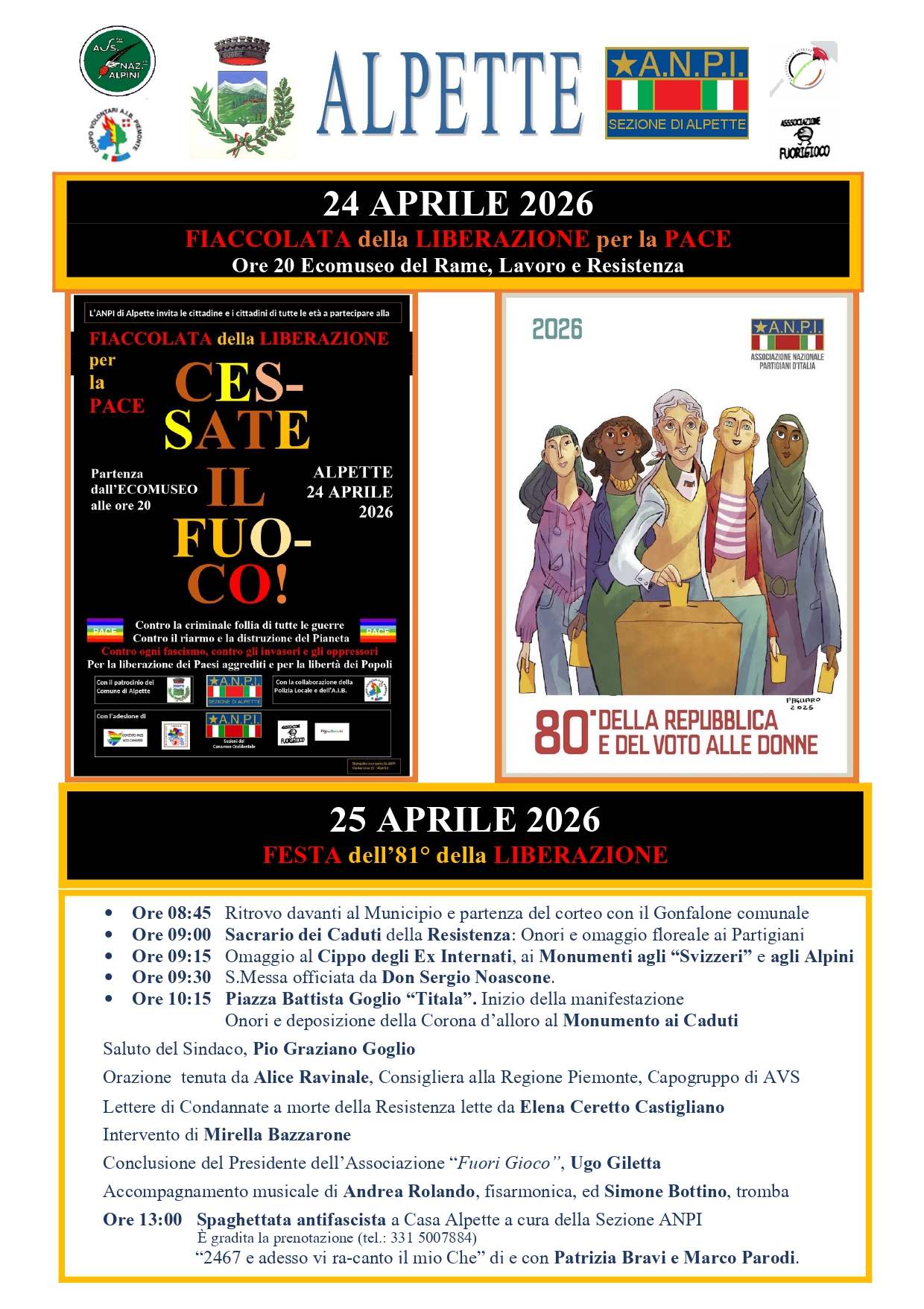 Il Comune di Alpette in collaborazione con la Sezione locale ANPI organizza la manifestazione civile con fiaccolata in data 24 aprile 2026 con partenza dall'Ecomuseo del Rame, Lavoro e Resistenza e arrivo davanti al Municipio e in data 25 aprile deposizione corona e fiori al cimitero comunale e monumenti vari e orazione in Piazza Goglio Battista "Titala", in allegato programma dettagliato.