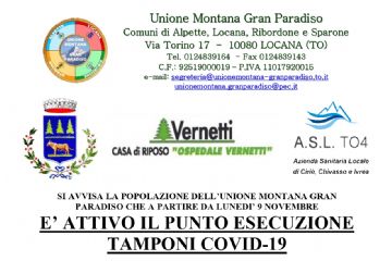 E' ATTIVO IL NUOVO PUNTO DI ESECUZIONE DEI TAMPONI COVID-19 A LOCANA IN FRAZIONE NUSIGLIE (CAMPO SPORTIVO)