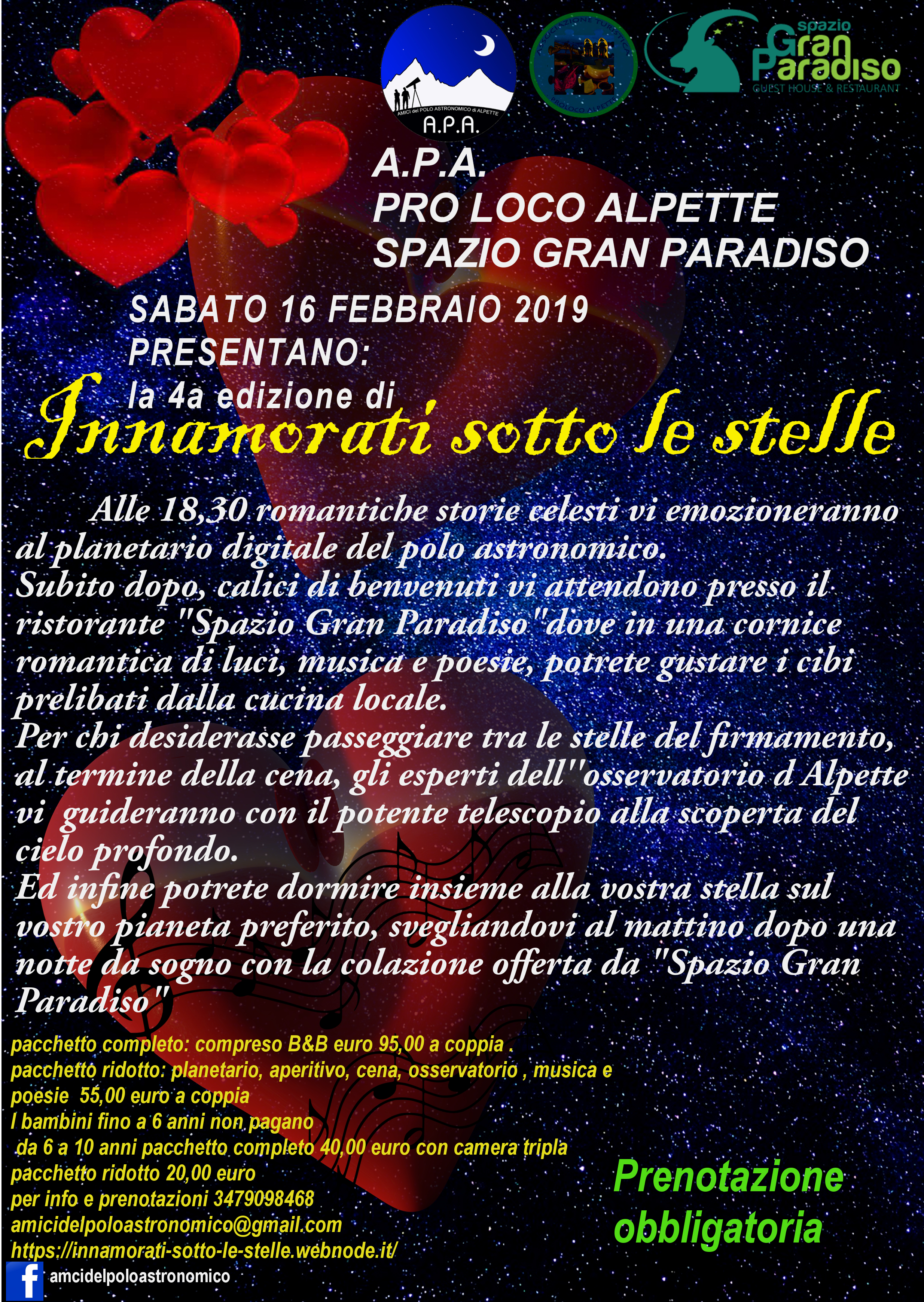 Anche quest’anno in occasione della festa di San Valentino, il polo astronomico di Alpette in collaborazione con A.P.A. , Pro Loco Alpette e Spazio Gran Paradiso vuole dare il suo contributo a quella che è la festa dell’amore Universale.