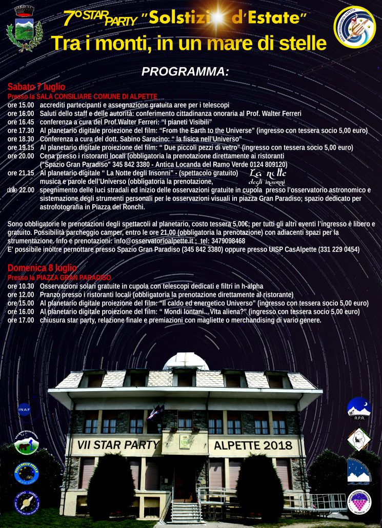 QUEST'ANNO IL TEMA E': "TRA I MONTI IN UN MARE DI STELLE" LO STAFF DEL POLO ASTRONOMICO DI ALPETTE CON IL PROF. FERRERI VI COIVOLGERANNO CON CONFERENZE E OSSERVAZIONI.